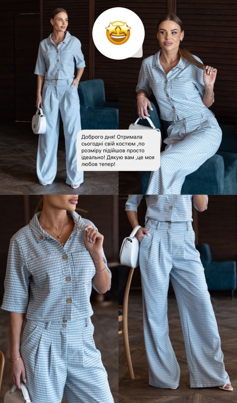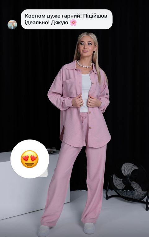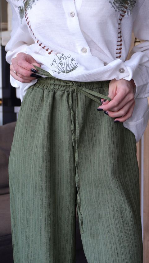 - Брюки палаццо: талія на резинці, вільно спадають донизу, виконані із льону "жатка неаполь"